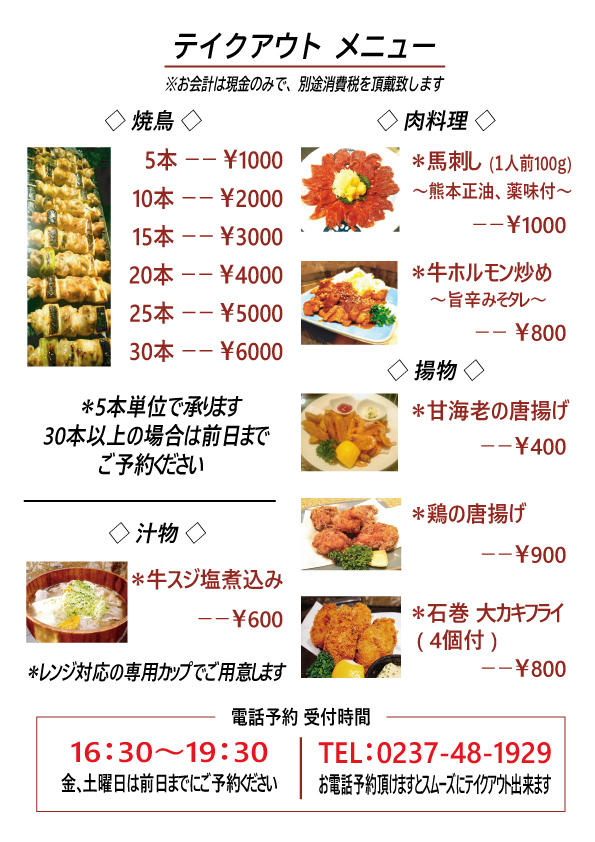 ◆ テイクアウト営業時間 【 17:30〜20:00 】
