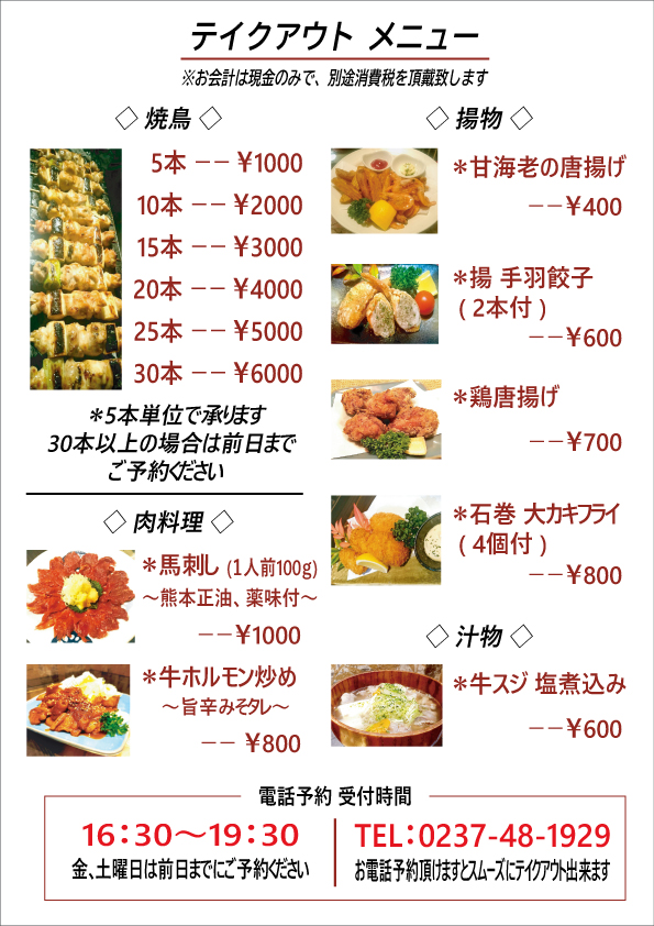 ◆ テイクアウト営業時間 【 17:30〜20:00 】