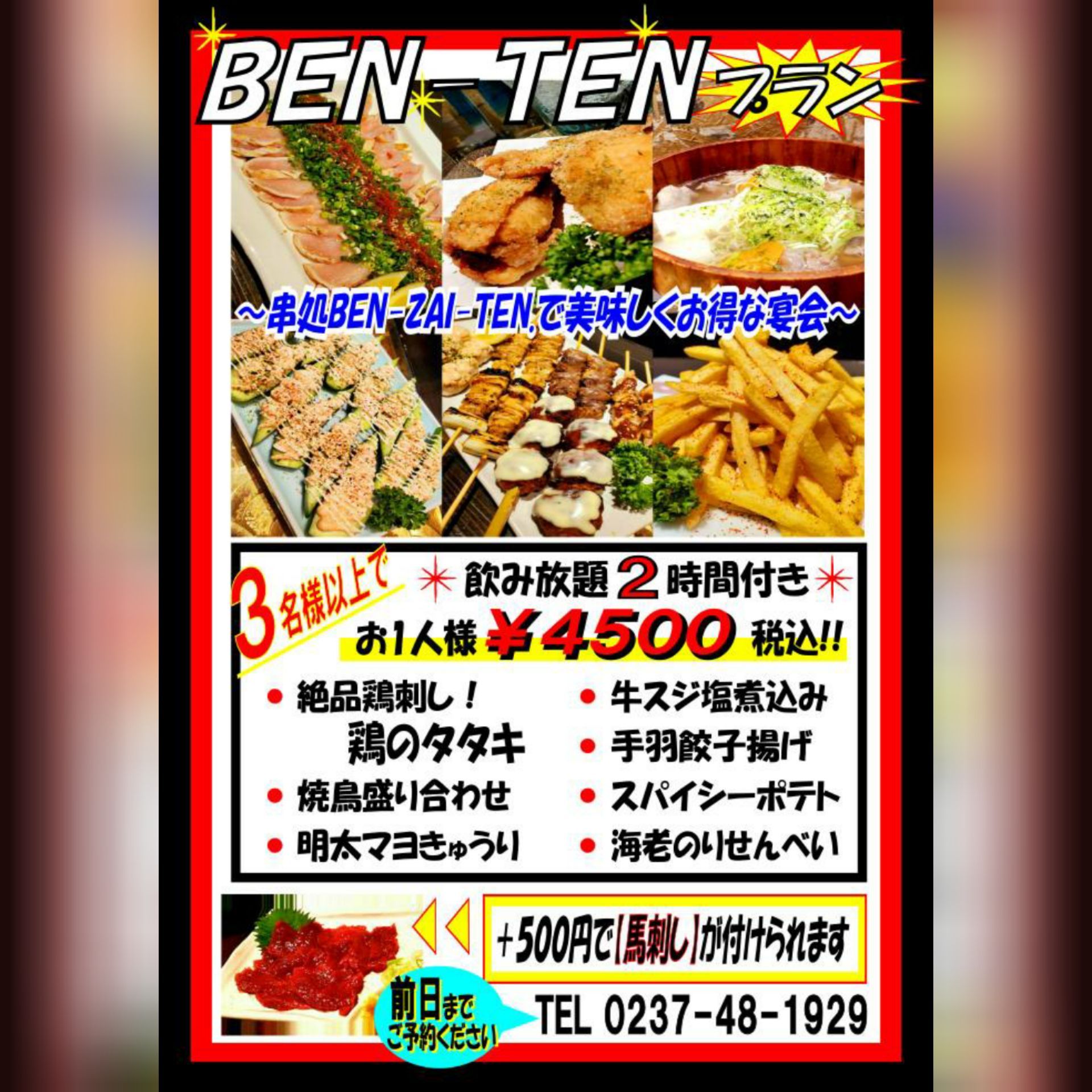 串処BEN-ZAI-TEN.は、山形県東根市神町にある焼鳥居酒屋です!地酒と焼鳥を中心に、馬刺・レバテキ等 メニューも豊富!🍺大人気の飲み放題は‟サントリー生ビール"付きです!🍜22時~夜鳴き醤油ラーメンもご提供中!🕒️17:30~24:00🅿️道路挟んで向かえ側に駐車場がございます。席数に限りがございますのでご予約をお勧めしております。皆様のご来店お待ちしております!系列店の美容室『ヘア リ・ゾートカナロア』は天童市東久野本にございます。