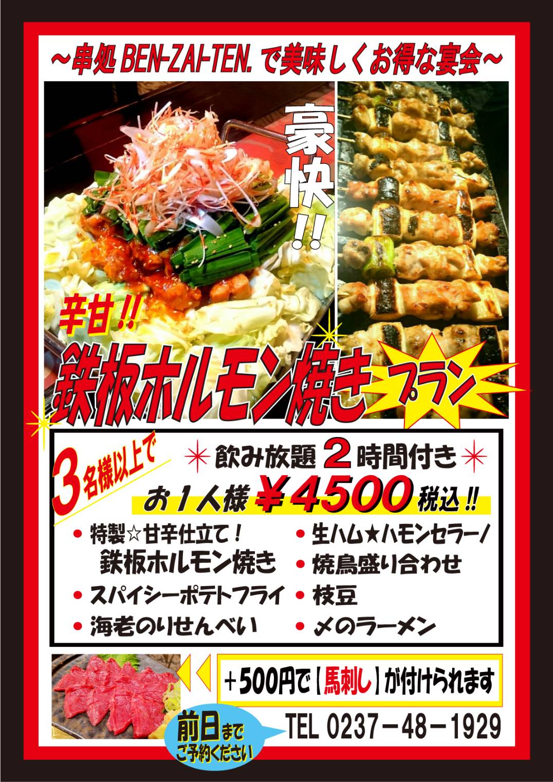 串処BEN-ZAI-TEN.は、山形県東根市神町にある焼鳥居酒屋です!地酒と焼鳥を中心に、馬刺・レバテキ等 メニューも豊富!🍺大人気の飲み放題は‟サントリー生ビール"付きです!🍜22時~夜鳴き醤油ラーメンもご提供中!🕒️17:30~24:00🅿️道路挟んで向かえ側に駐車場がございます。席数に限りがございますのでご予約をお勧めしております。皆様のご来店お待ちしております!系列店の美容室『ヘア リ・ゾートカナロア』は天童市東久野本にございます。