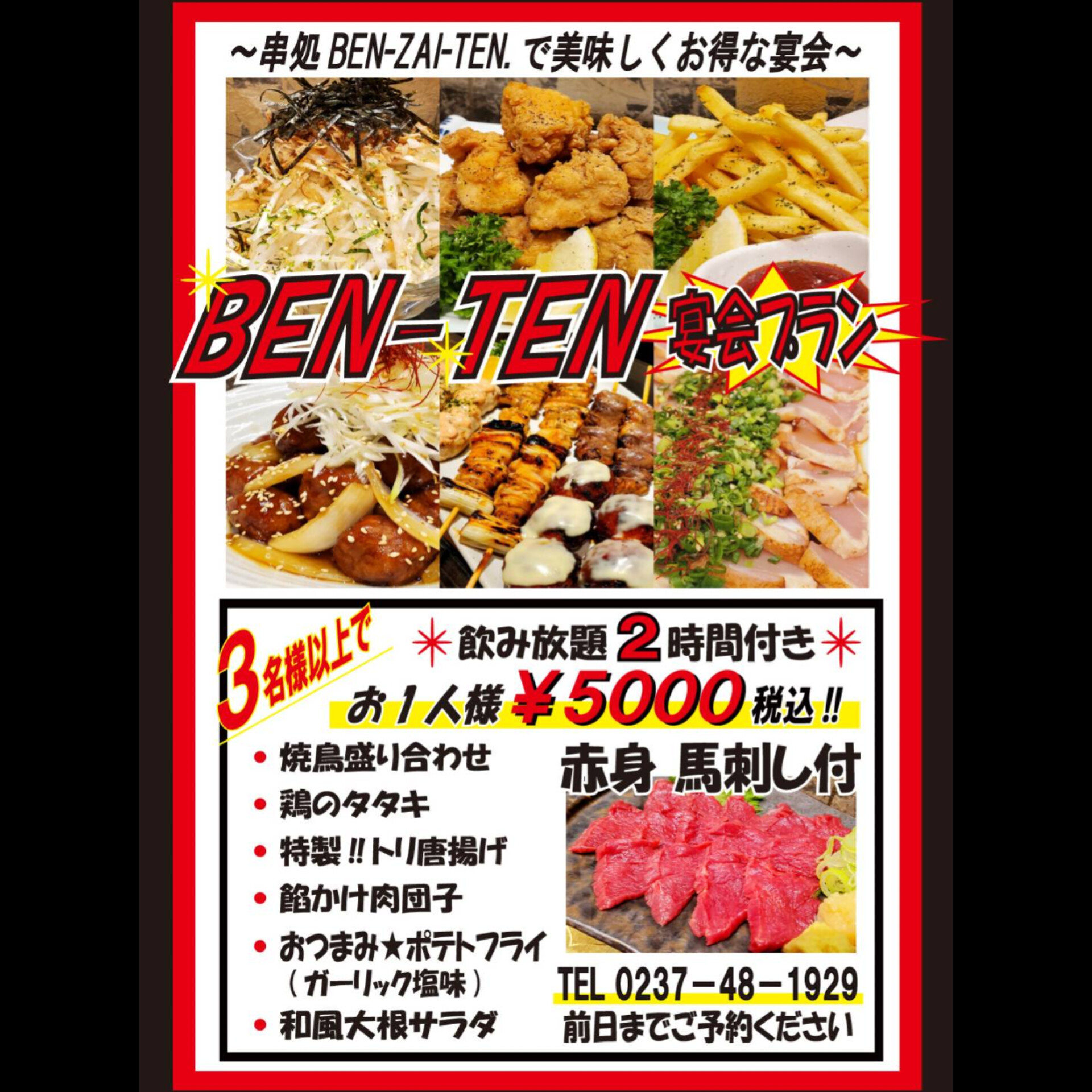 串処BEN-ZAI-TEN.は、山形県東根市神町にある焼鳥居酒屋です!地酒と焼鳥を中心に、馬刺・レバテキ等 メニューも豊富!🍺大人気の飲み放題は‟サントリー生ビール"付きです!🍜22時~夜鳴き醤油ラーメンもご提供中!🕒️17:30~24:00🅿️道路挟んで向かえ側に駐車場がございます。席数に限りがございますのでご予約をお勧めしております。皆様のご来店お待ちしております!系列店の美容室『ヘア リ・ゾートカナロア』は天童市東久野本にございます。